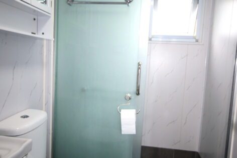 - The extensive bathroom features a glassed-in shower recess, good size vanity with storage and a toilet. There is an extra separate guest toilet.
