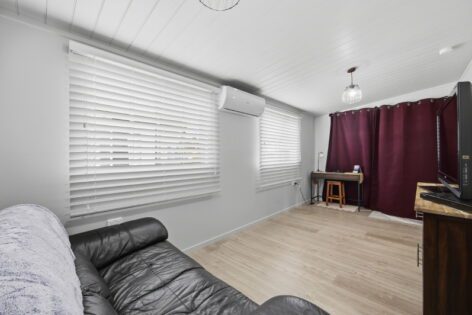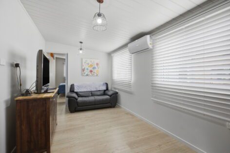 - Open plan carpeted living/ dining area with ceiling fan, split system air conditioner and sliding door access to the front patio.
