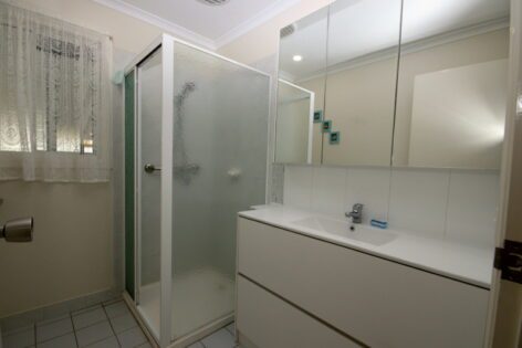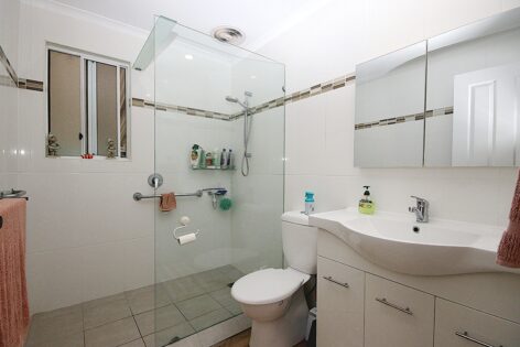- The bathroom is in good condition & consists of a glassed-in shower, vanity with storage and a separate toilet