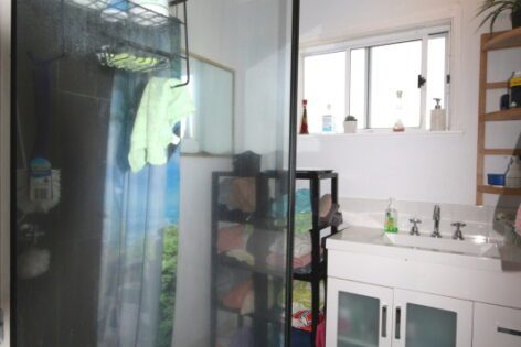 - The modern bathroom consists off a glassed-in shower recess, vanity and toilet.