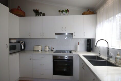 - The kitchen is in good condition with ample storage cabinets and is complemented with a near new Euromaid electric stove, water filter, stainless steel sink and tiled backsplash.
