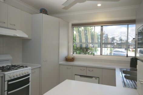 - The recently renovated kitchen features white cabinets & drawers with light coloured laminate benchtops that are complemented with built-in oven, ceramic cooktop and a designated space for a dishwasher.