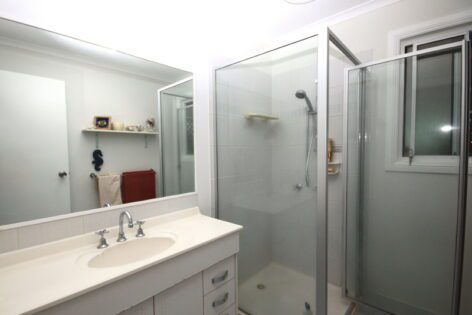 - Fully renovated modern bathroom featuring a large walk-in shower, stylish vanity with stone benchtop and a separate toilet.